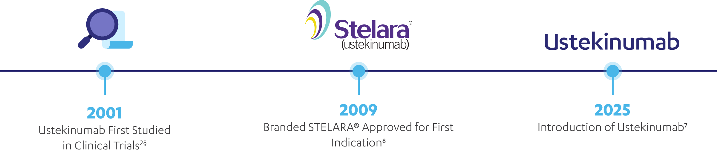 References: 1. U.S. Food and Drug Administration. FAQs–Purple Book. Accessed February 27, 2025. https://purplebooksearch.fda.gov/faqs 2. Data on file. Janssen Biotech, Inc. 3. U.S. Food and Drug Administration. Review and Approval. Accessed December 10, 2024. https://www.fda.gov/drugs/biosimilars/review-and-approval 4. Declerck P, Farouk-Rezk M, Rudd PM. Biosimilarity versus manufacturing change: two distinct concepts. Pharm Res. 2016;33(2):261-268. doi:10.1007/s11095-015-1790-3 5. U.S. Food and Drug Administration. Biological Product Definitions. Accessed April 1, 2025. 6. U.S. Food and Drug Administration. Scientific Considerations in Demonstrating Biosimilarity to a Reference Product. Published April 2015. Accessed January 23, 2025. https://www.fda.gov/media/82647/download 7. Ustekinumab [Prescribing Information]. Horsham, PA: Janssen Biotech, Inc. 8. STELARA® [Prescribing Information]. Horsham, PA: Janssen Biotech, Inc. 9. AnalySource®. Accessed February 20, 2025. https://www.analysource.com/